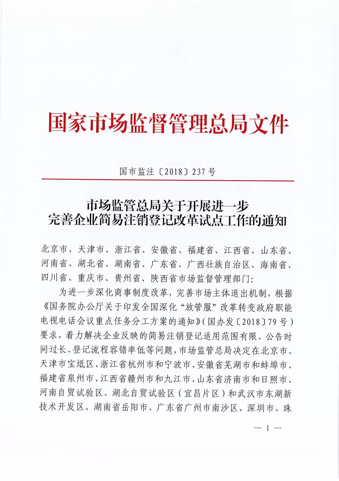 市場監(jiān)管總局關(guān)于開展進一步完善企業(yè)簡易注銷登記改革試點工作的通知(國市監(jiān)注〔2018〕237號)
